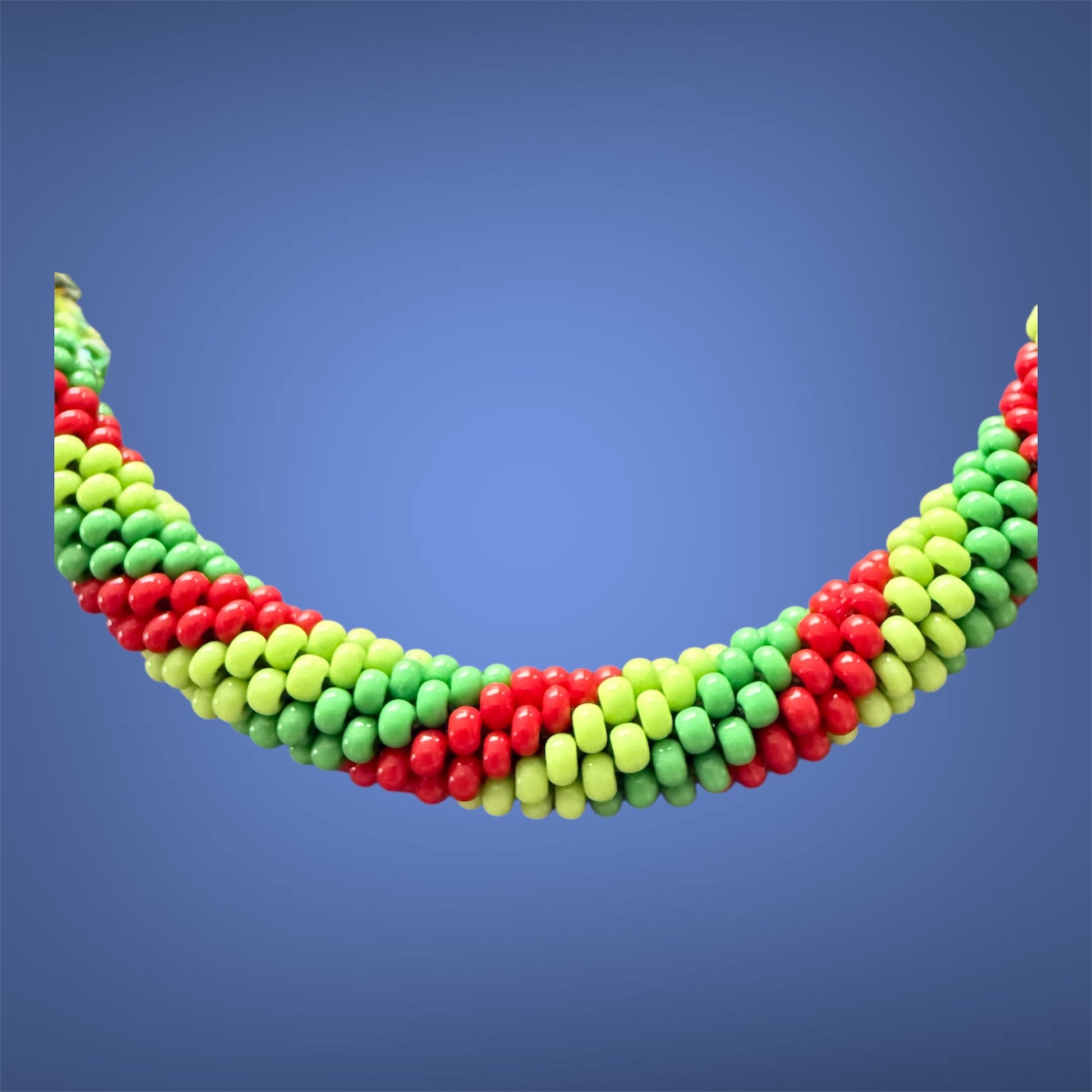 Dieses handgefertigte Perlenarmband vereint leuchtendes Rot, Grün und Hellgrün in einem modernen Spiralmuster - ein echter Blickfang für jedes Outfit.
